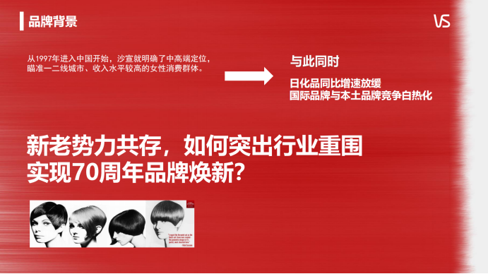 案例主体处境: 沙宣自1997年进入中国便确立了中高端定位 。但在新老势力共存的当下,品牌亟需解决如何破除行业重围、实现70周年品牌形象全面焕新的严峻课题 。