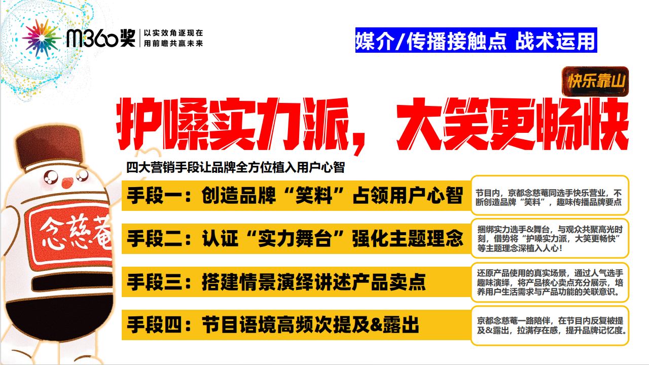 核心策略: 锚定脱口秀“高频用嗓”与观众“放声大笑”的极致场景,以“专业护嗓,大家的快乐靠山”为战略原点,建立产品功能与情绪价值的深度强关联 。